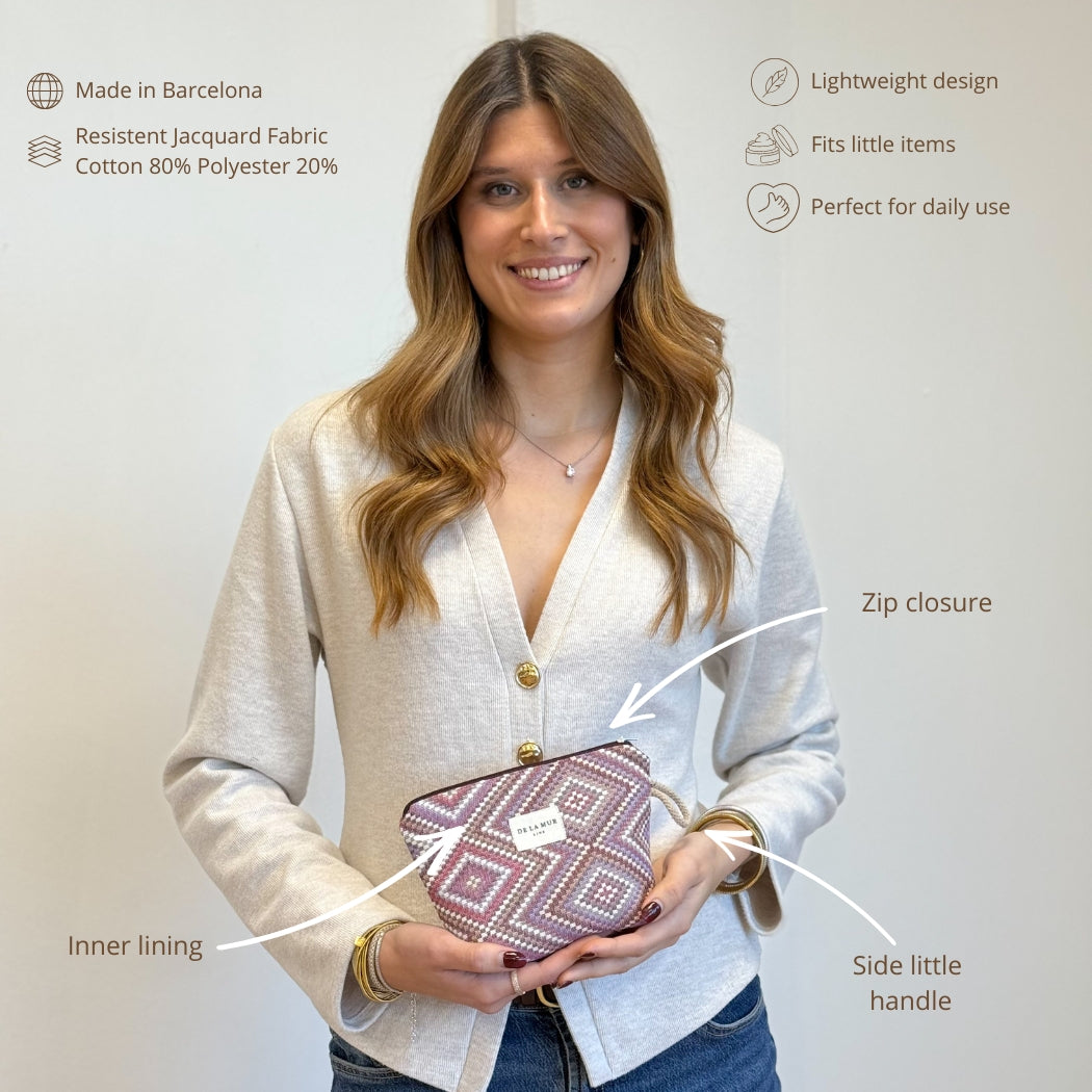Small pouch with a zipper on top and a side handle made of beige cord. Made of thick jacquard fabric, 80% cotton and 20% polyester, with a geometric pattern in shades of pink and lilac. Each item may have slight variations in the pattern, depending on where the fabric was cut. For proper care, hand wash in cold water and do not tumble dry.