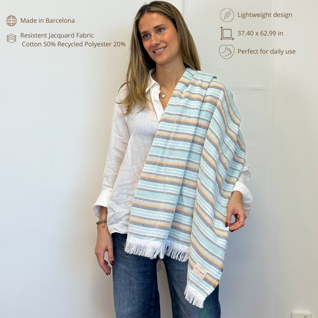 Lightweight multipurpose towel made from recycled cotton blend with a vibrant multicolor striped design. Soft, quick-drying, and easy to pack—perfect for the beach, pool, travel, and summer escapes. Crafted in Spain.