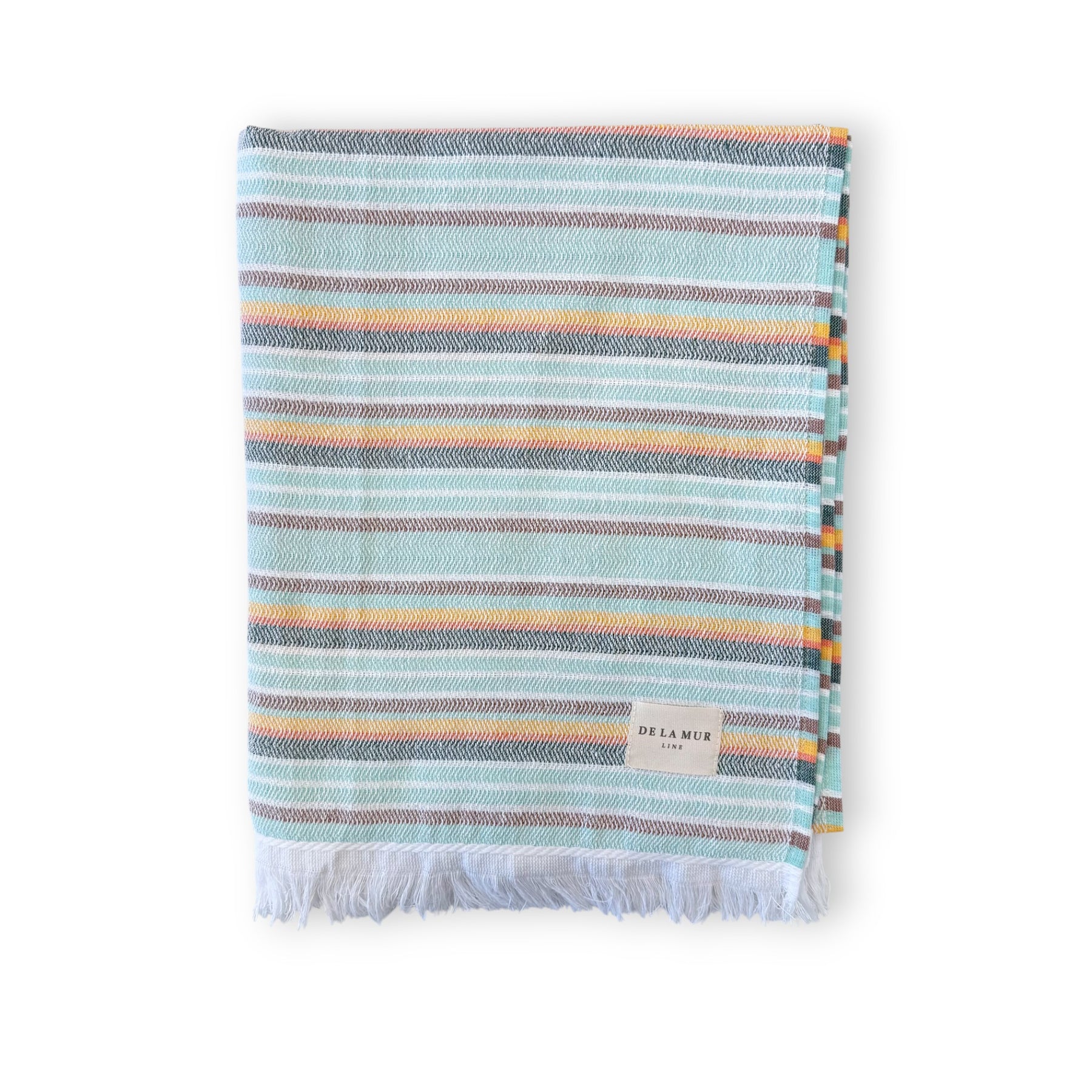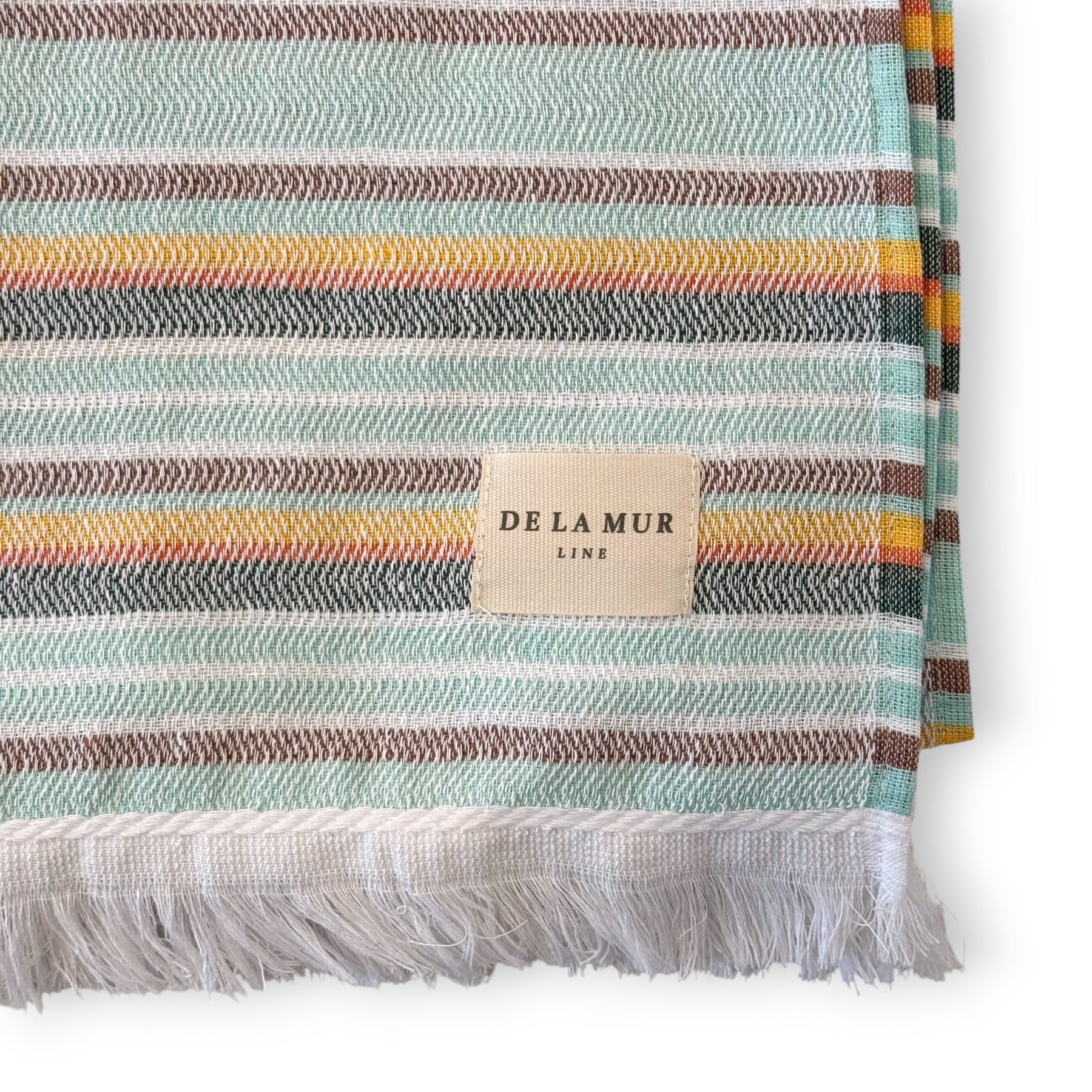 Multipurpose towel made from lightweight fabric (50% recycled cotton, 50% polyester) with fringed edges. Features a multicolor striped pattern. One size fits all. For proper care, it is recommended to wash in cold water and not tumble dry.
