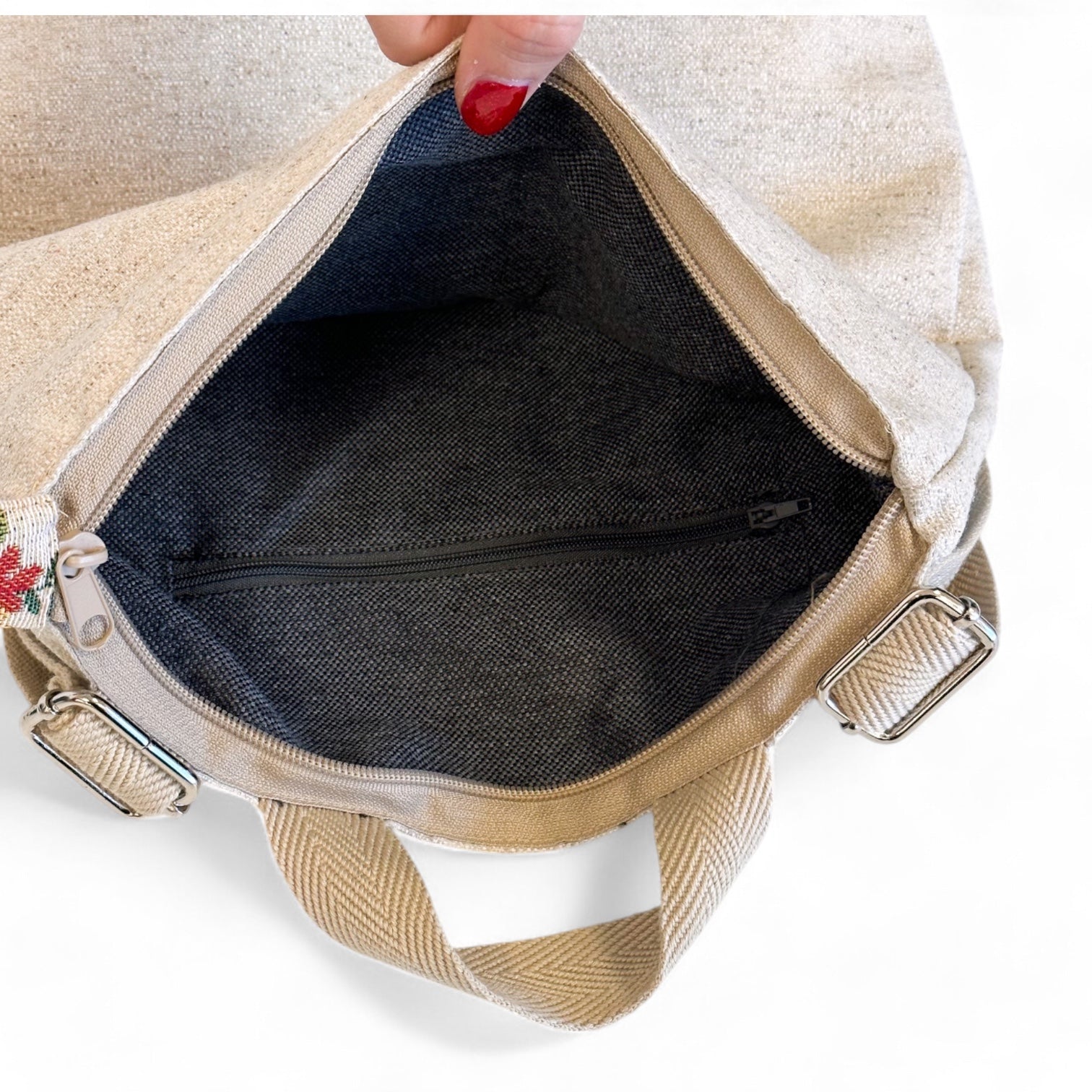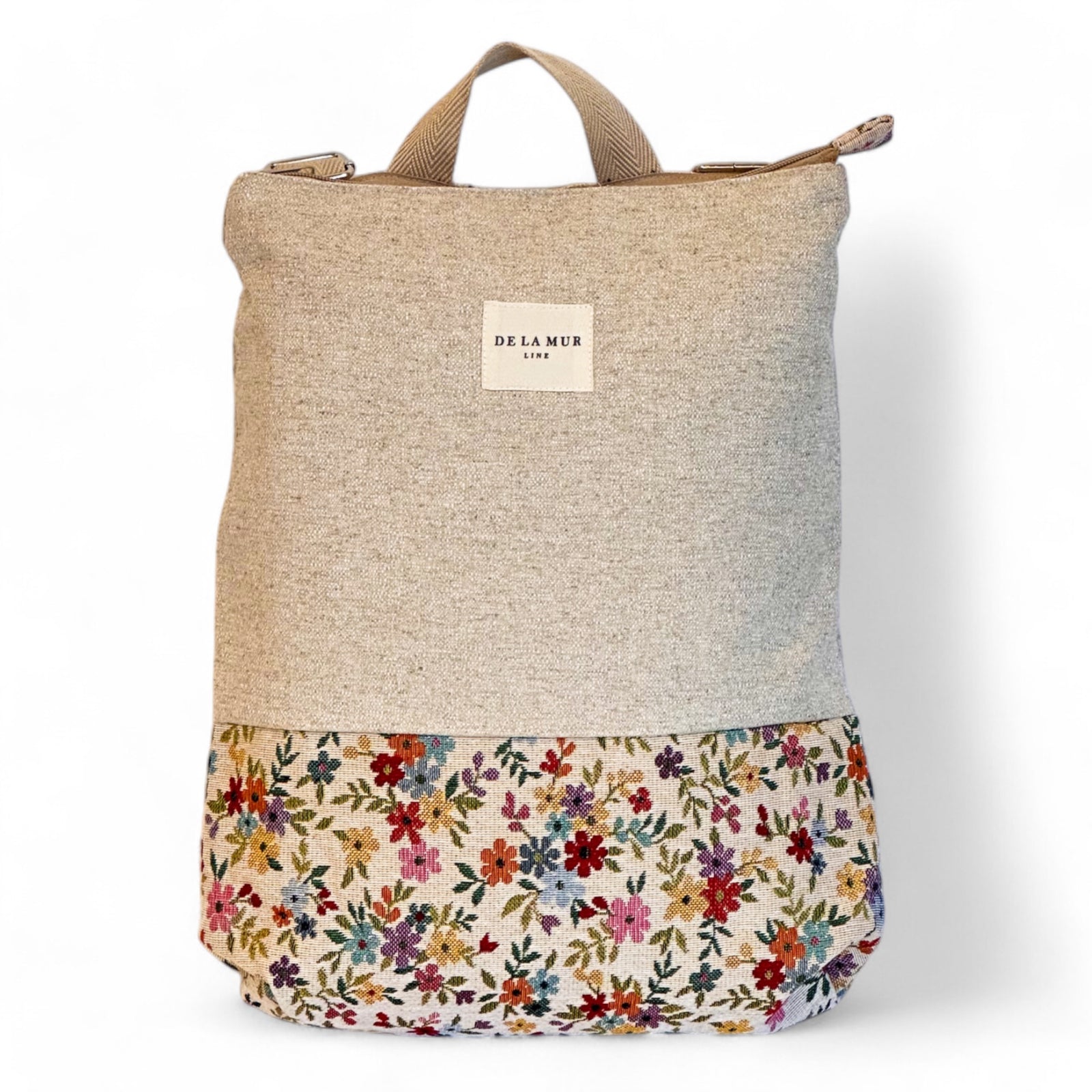 Backpack with adjustable straps and a small top handle. Made with a combination of two different fabrics: a thick upholstery fabric on the upper section and thick jacquard fabric with a floral print on a beige background on the lower section. Features an interior zip pocket. Straps are made from beige cotton herringbone tape. For proper care, we recommend washing in cold water and not using a tumble dryer.
