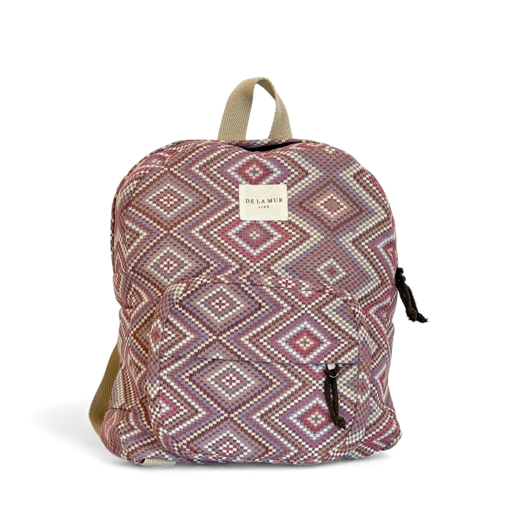 Backpack with adjustable straps and a front pocket. Made from jacquard fabric (80% cotton, 20% polyester) featuring a geometric pattern in pink and lilac tones. Includes an interior zippered pocket. Straps are made from beige cotton herringbone webbing. For proper care, we recommend washing in cold water and not tumble drying.