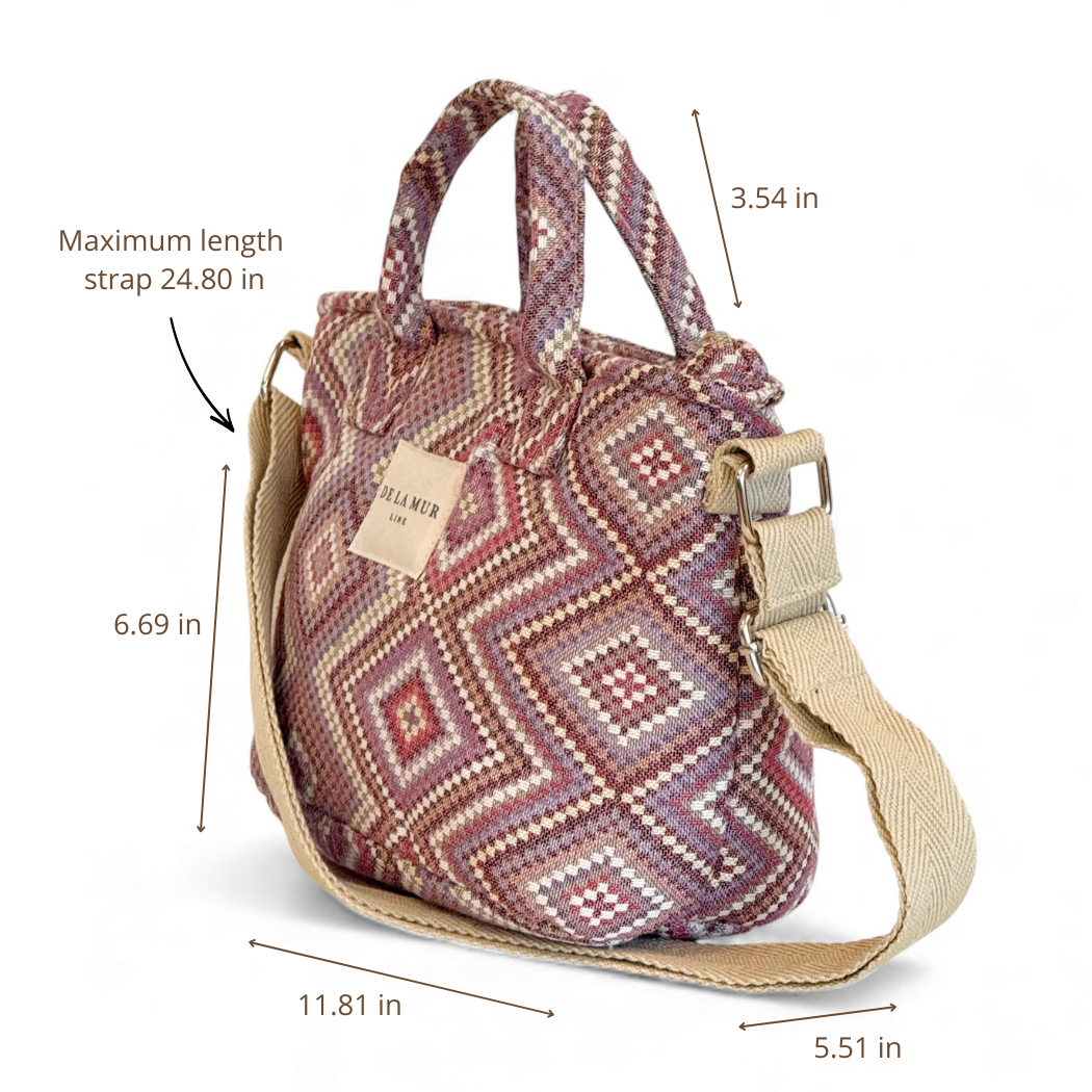 Basket-style jacquard bag with a geometric pattern in lilac and pink tones, designed to add a fresh, playful touch to everyday looks. Lightweight and practical, with a secure zip closure and interior pocket—carry it by hand or wear it crossbody for effortless style. Made in Spain.