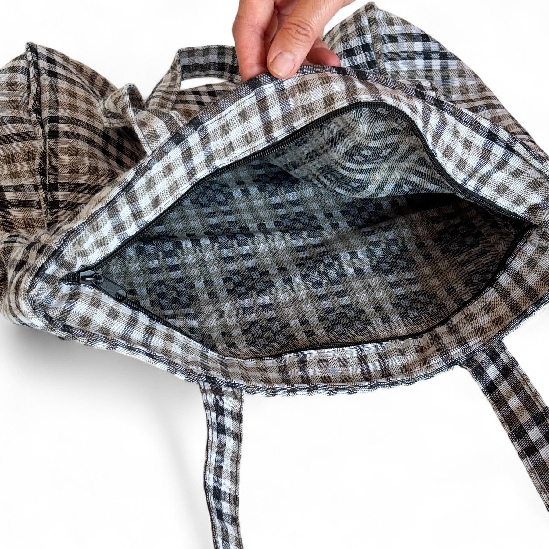 Made from thick jacquard fabric with a beige and black checkered pattern.