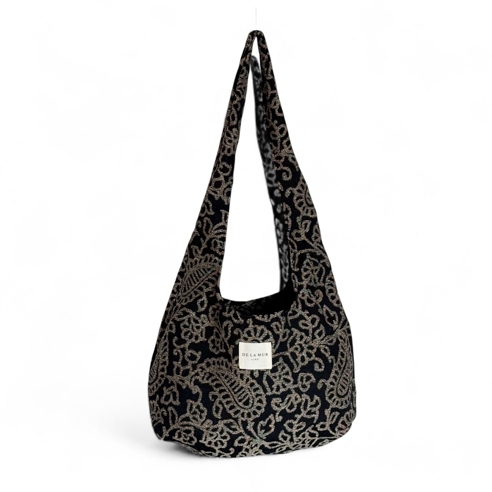 Made from thick jacquard fabric with a beige floral pattern on a black background. For proper care, we recommend hand washing in cold water and avoiding the dryer.