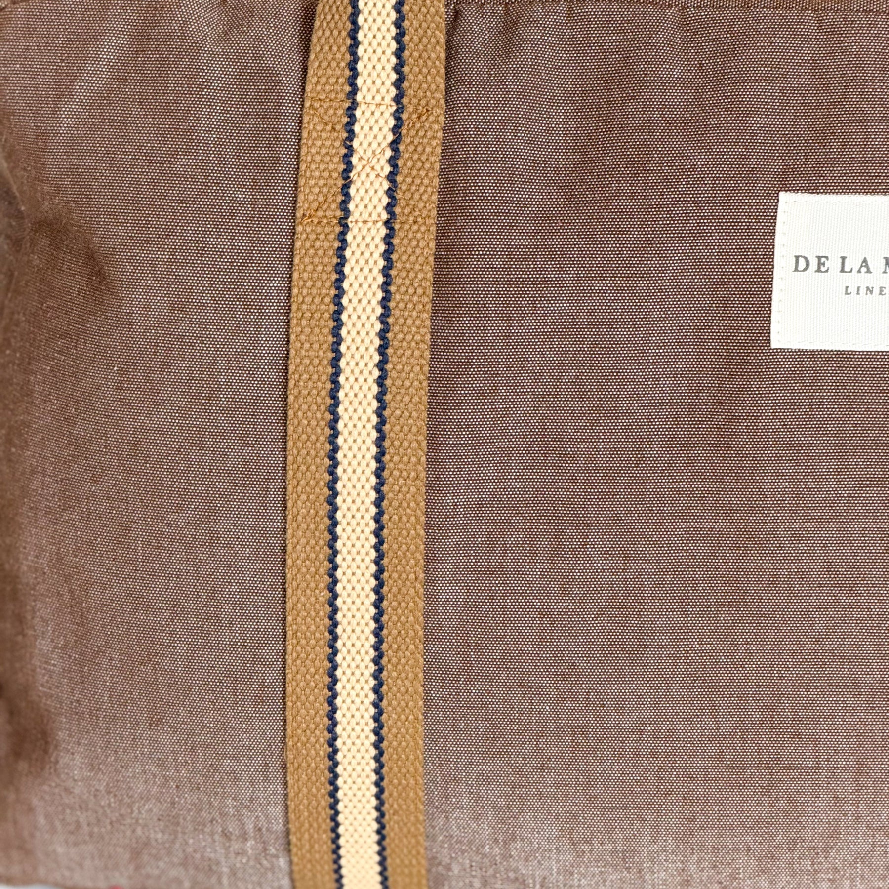 Sports bag with medium handles on top made of brown cotton tape with a central beige stripe. Made of thick plain brown fabric. Top zipper closure in gray. Interior zippered pocket. Lined with thick gray fabric on the inside. For proper care, hand wash in cold water and do not use a dryer.