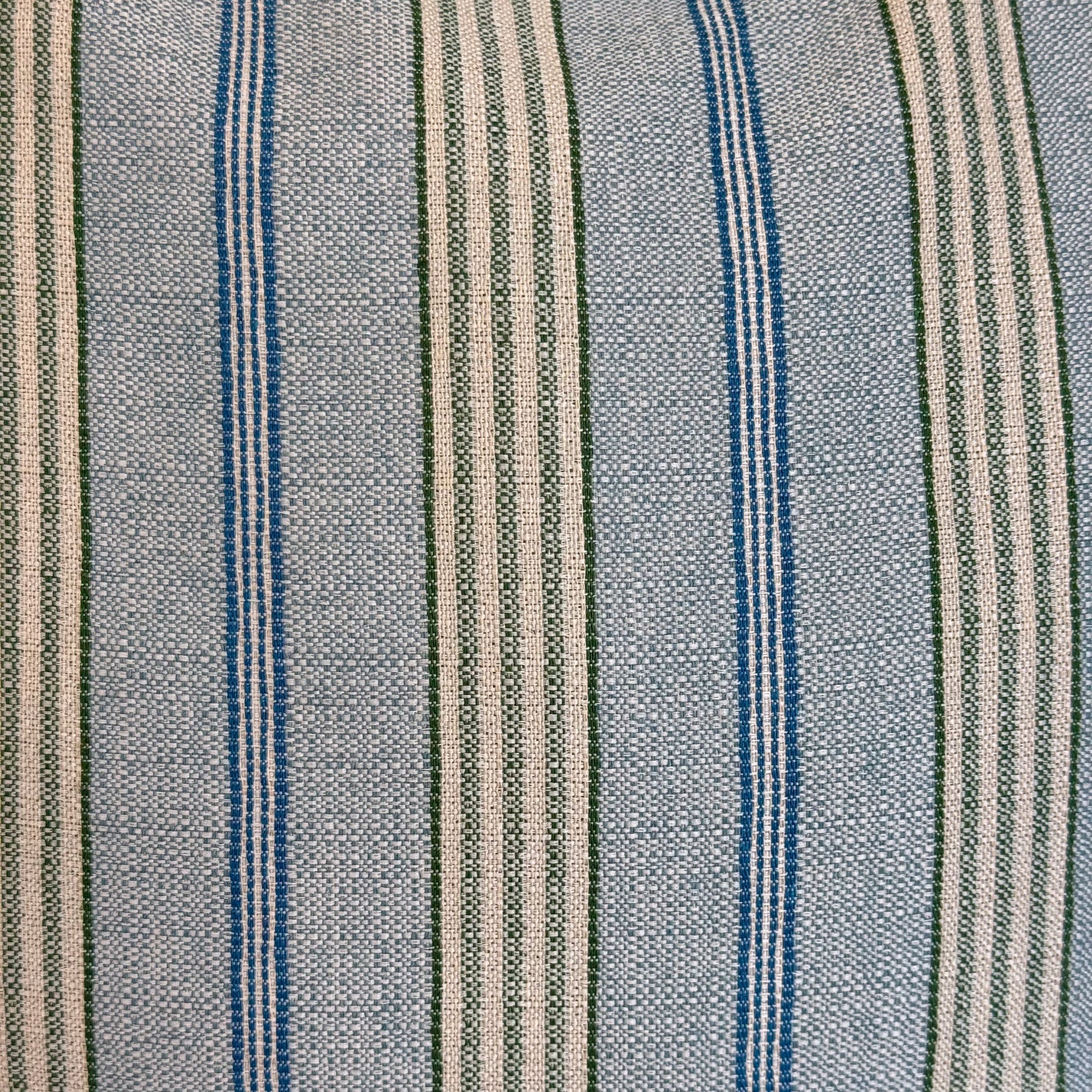 Extra-large zippered pouch with a top zipper closure and fabric handles. Made from jacquard fabric (80% cotton, 20% polyester) featuring a striped pattern in blue and green tones. Lined with sturdy gray fabric on the inside. For proper care, we recommend washing in cold water and not tumble drying.