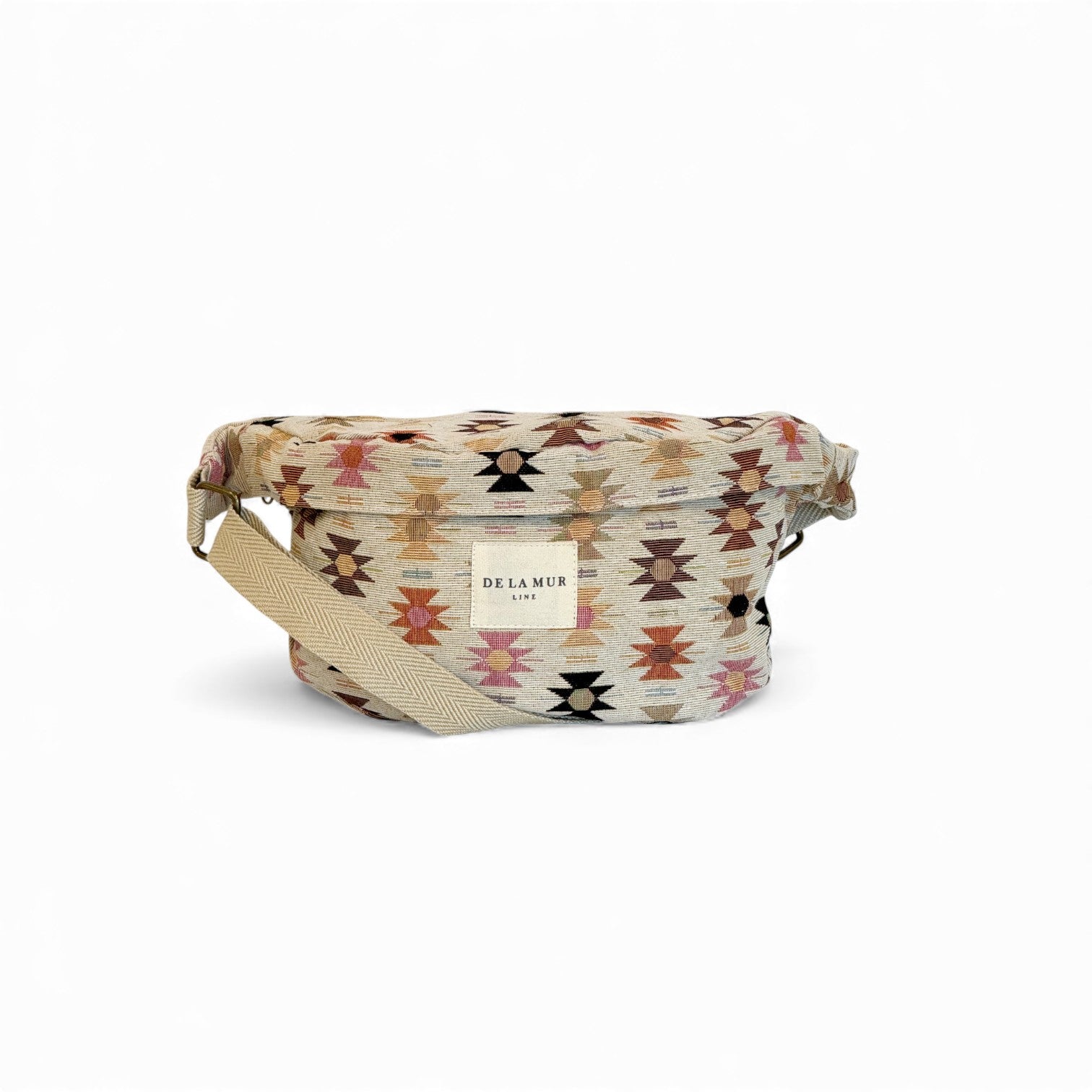 Fanny pack worn crossbody with a long, adjustable beige cotton herringbone strap. Made from jacquard fabric (80% cotton, 20% polyester) featuring a geometric pattern in pink and orange tones on a beige background. Features a top zipper closure, an interior pocket, and a sturdy gray fabric lining. For proper care, we recommend hand washing in cold water and not tumble drying.