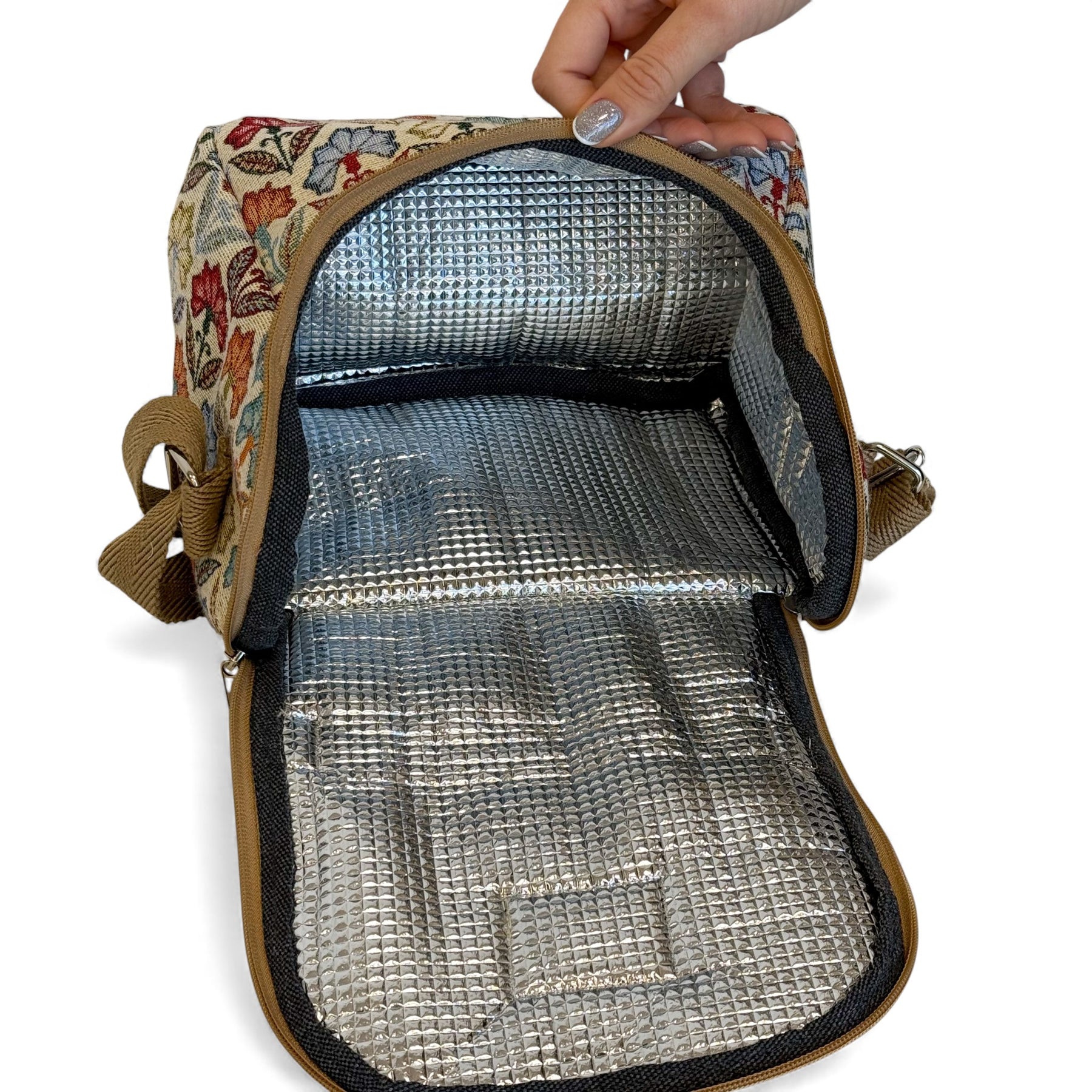 Insulated lunch bag made from thick jacquard fabric (80% cotton, 20% polyester) with a multicolor floral print on the exterior and an insulating thermal lining inside to help maintain temperature. Features a top handle for carrying by hand and an adjustable toasted-beige cotton webbing strap for wearing crossbody.