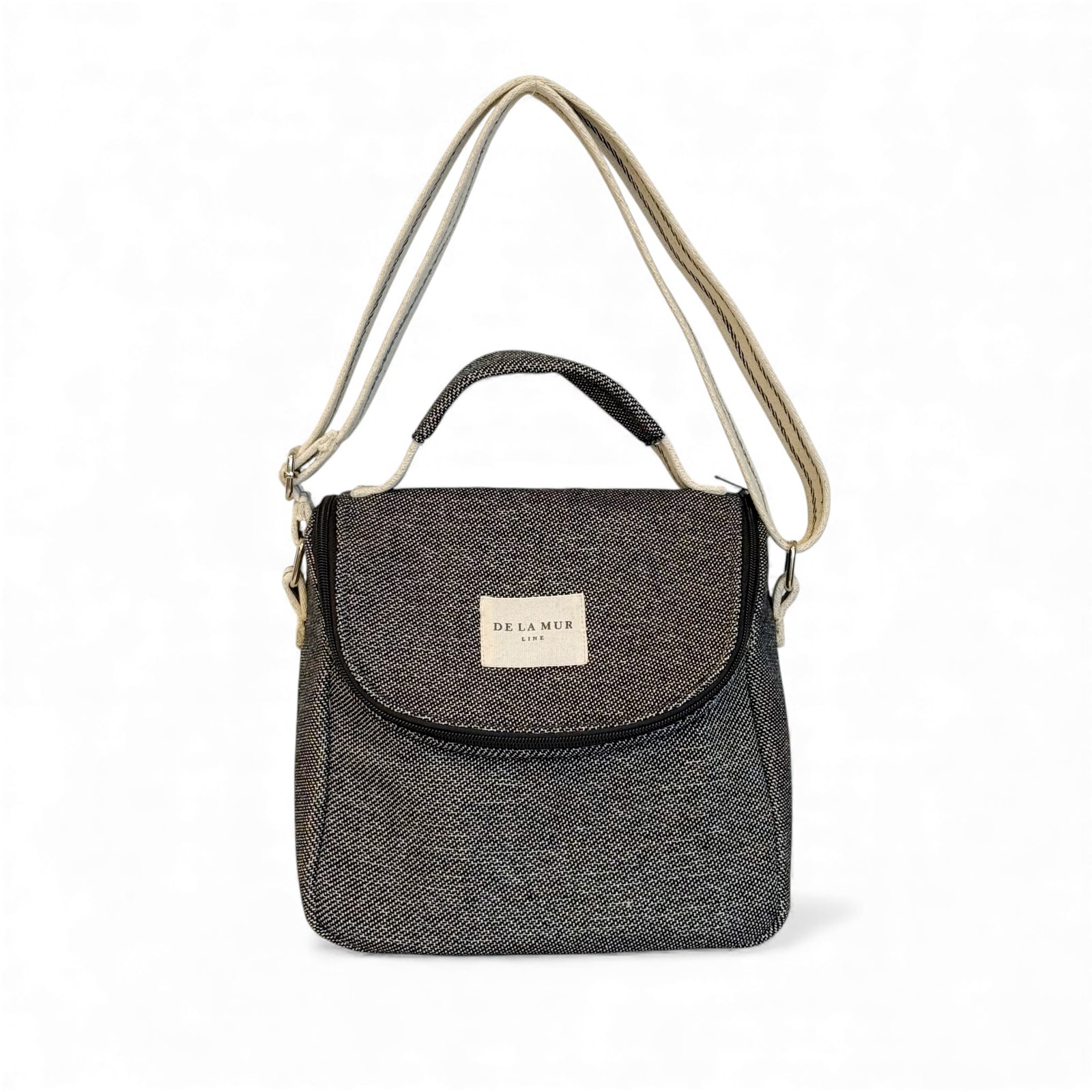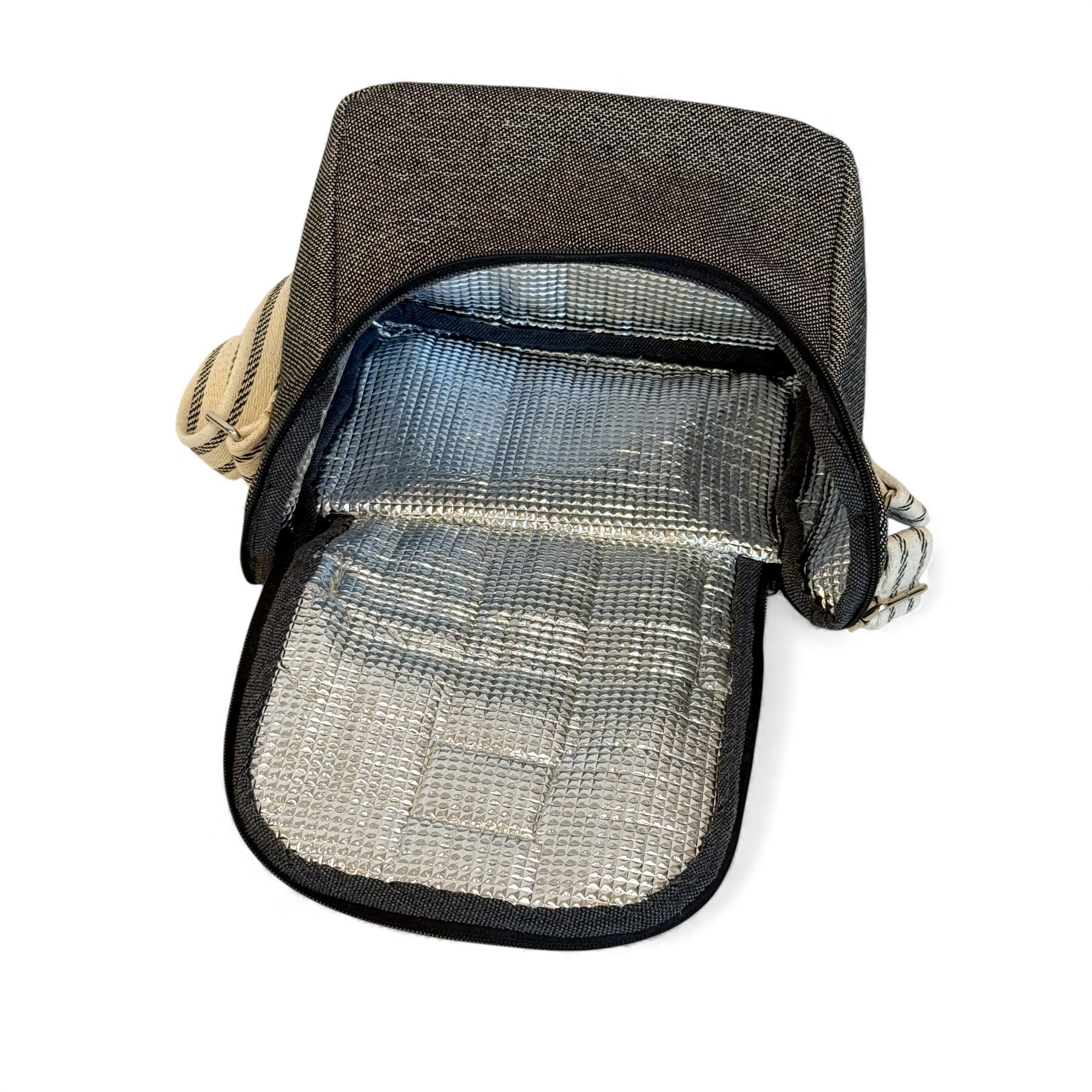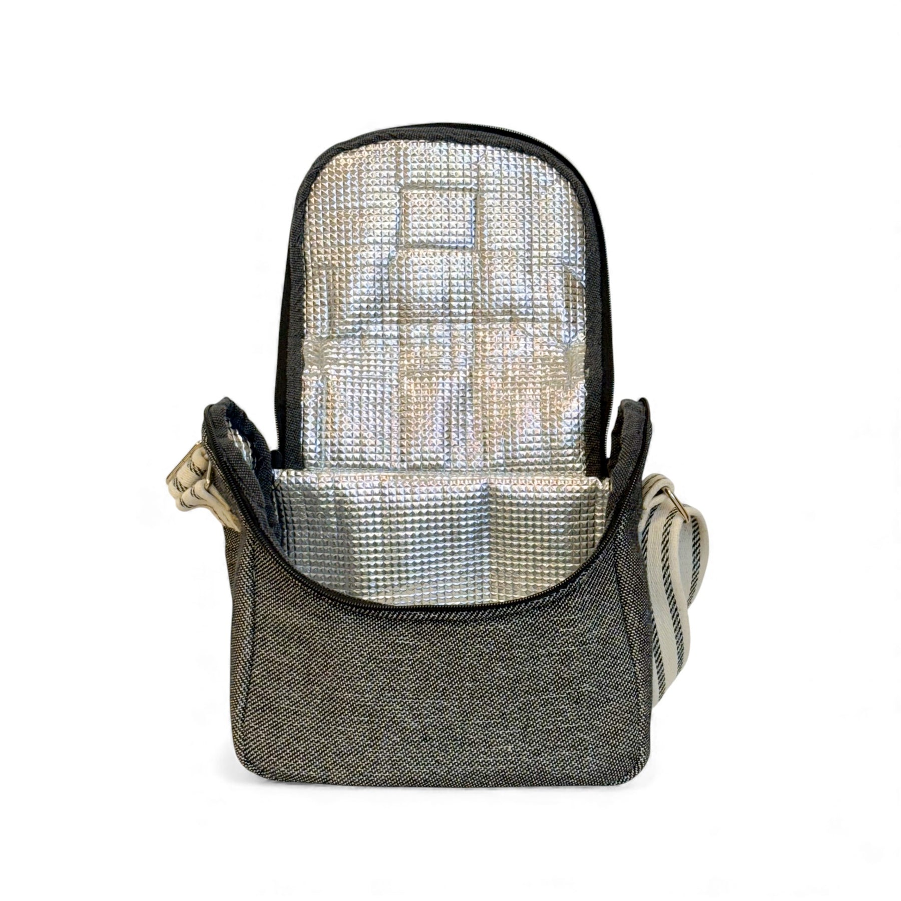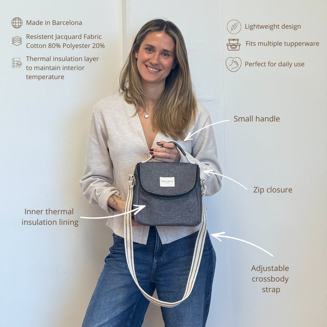 Insulated Lunch Bag. Made from thick jacquard fabric (80% cotton, 20% polyester) in dark black/grey on the exterior, with an insulated lining to keep your food at the right temperature. Features a top handle for carrying by hand and an adjustable natural cotton strap with black side stripes for crossbody wear. For proper care, we recommend washing in cold water and avoiding the dryer.