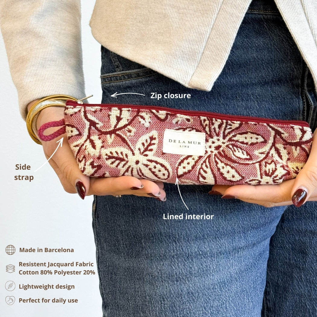 Zippered jacquard pouch with an ecru floral pattern on a soft pink background, designed for elegant everyday organization. Compact and versatile, perfect for storing pens, pencils, or makeup brushes while keeping your essentials neatly in place. Made in Spain.