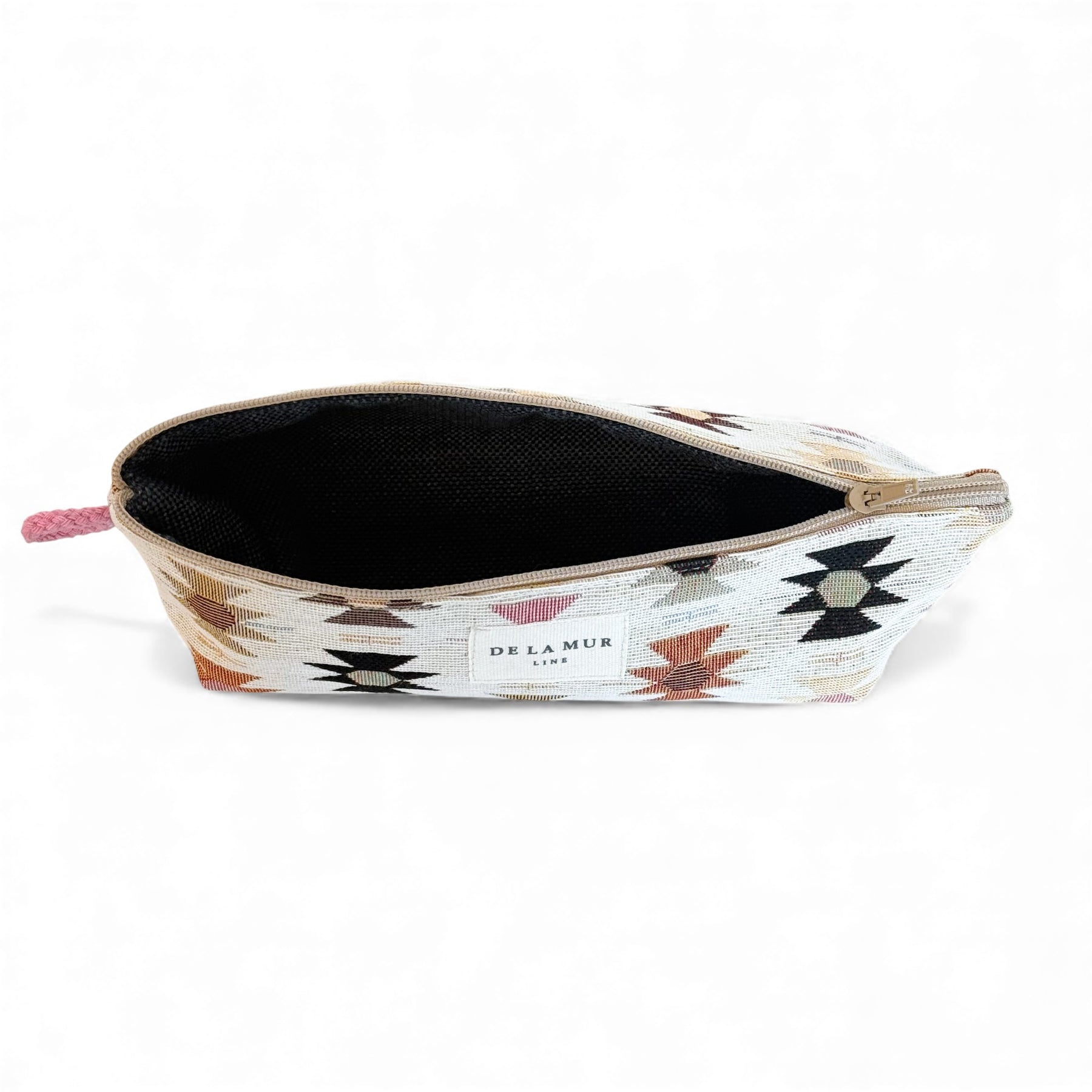 Zippered jacquard pouch with a lilac and pink geometric pattern, designed for stylish everyday organization. Compact and versatile, perfect for storing pens, pencils, or makeup brushes while keeping your essentials neatly organized. Made in Spain.