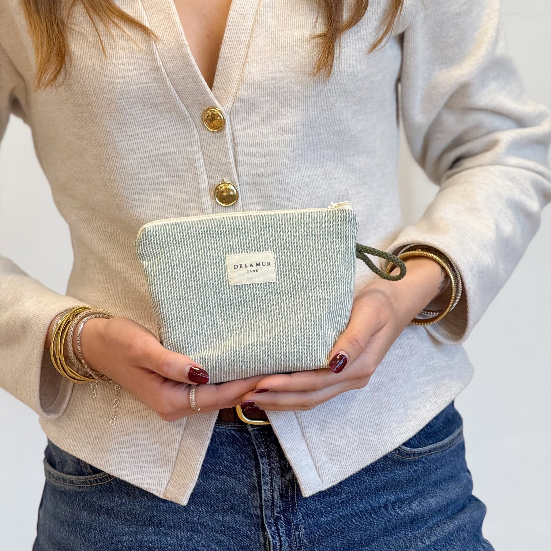 Small pouch with a top zipper and a green cord side handle. Made of fine textured fabric, 80% cotton and 20% polyester, with a light green striped pattern. Each item may have slight variations in the pattern depending on where the fabric was cut. For proper care, wash in cold water and do not tumble dry.
