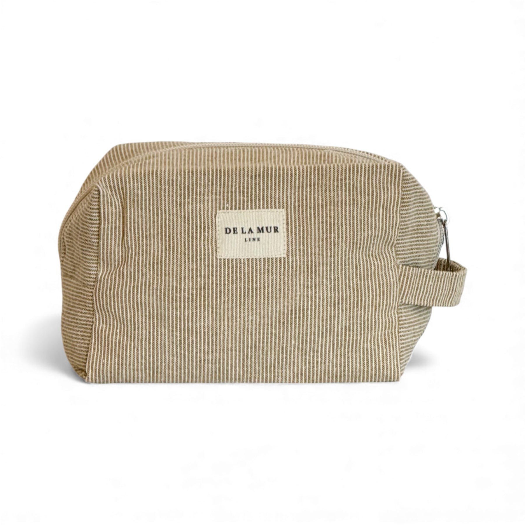 Squared toiletry pouch with a top zipper and side handle. Made from thick jacquard fabric (80% cotton, 20% polyester) with a soft light-mustard striped pattern.