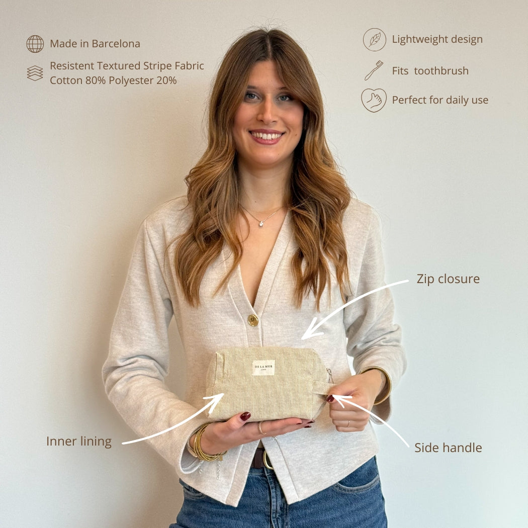 Light-mustard striped jacquard toiletry pouch with top zipper and side handle—perfect for organizing makeup, skincare, and small essentials.