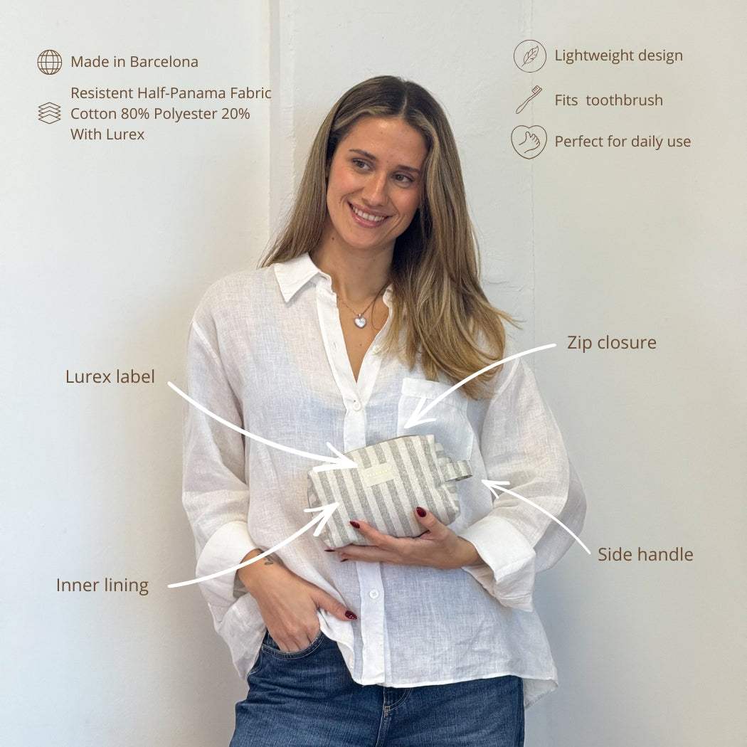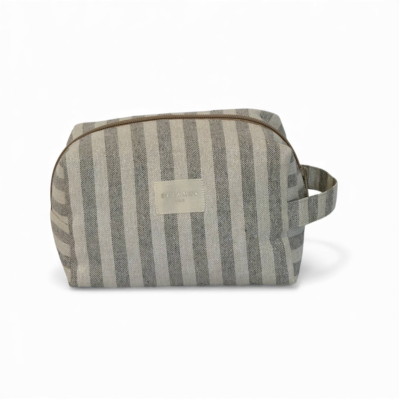 Striped half-panama toiletry pouch in ecru and gray with subtle Lurex sparkle, top zipper, and side handle—perfect for keeping makeup, skincare, and small essentials organized in style.