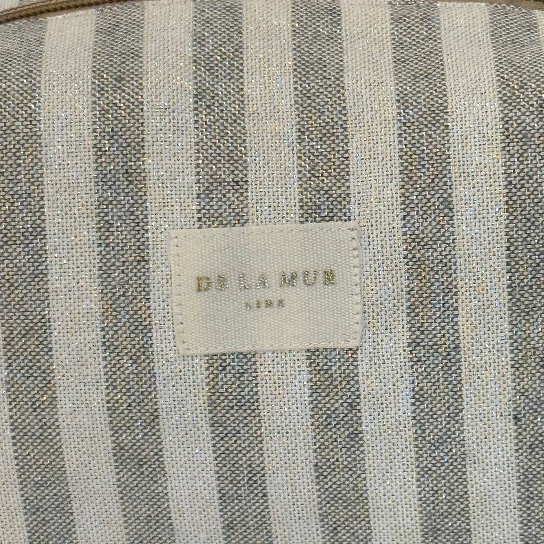 Squared toiletry pouch with a top zipper and side handle. Made from lightweight half-panama fabric (80% cotton, 20% polyester) with stripes in ecru and gray tones with Lurex accents. Features a brand label with gold Lurex. For proper care, it is recommended to wash in cold water and not tumble dry.