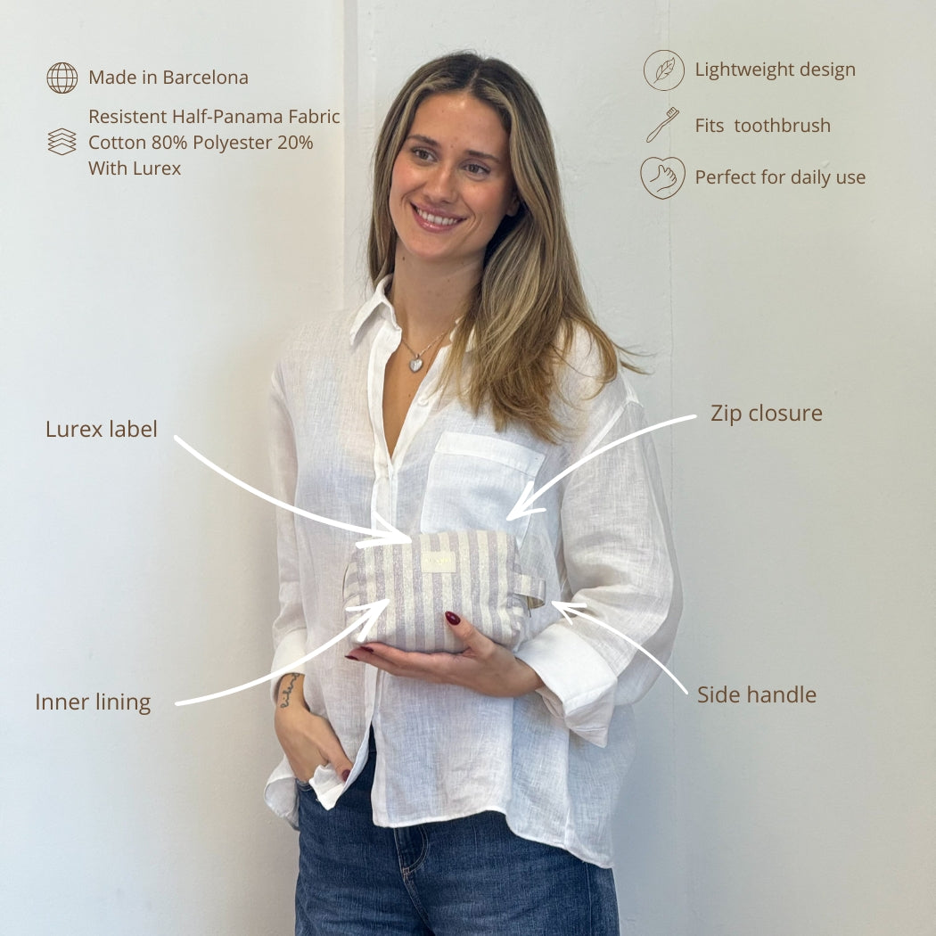 Striped half-panama toiletry pouch in ecru and lilac with subtle Lurex sparkle, top zipper, and side handle—perfect for keeping makeup, skincare, and small essentials organized wherever you go.