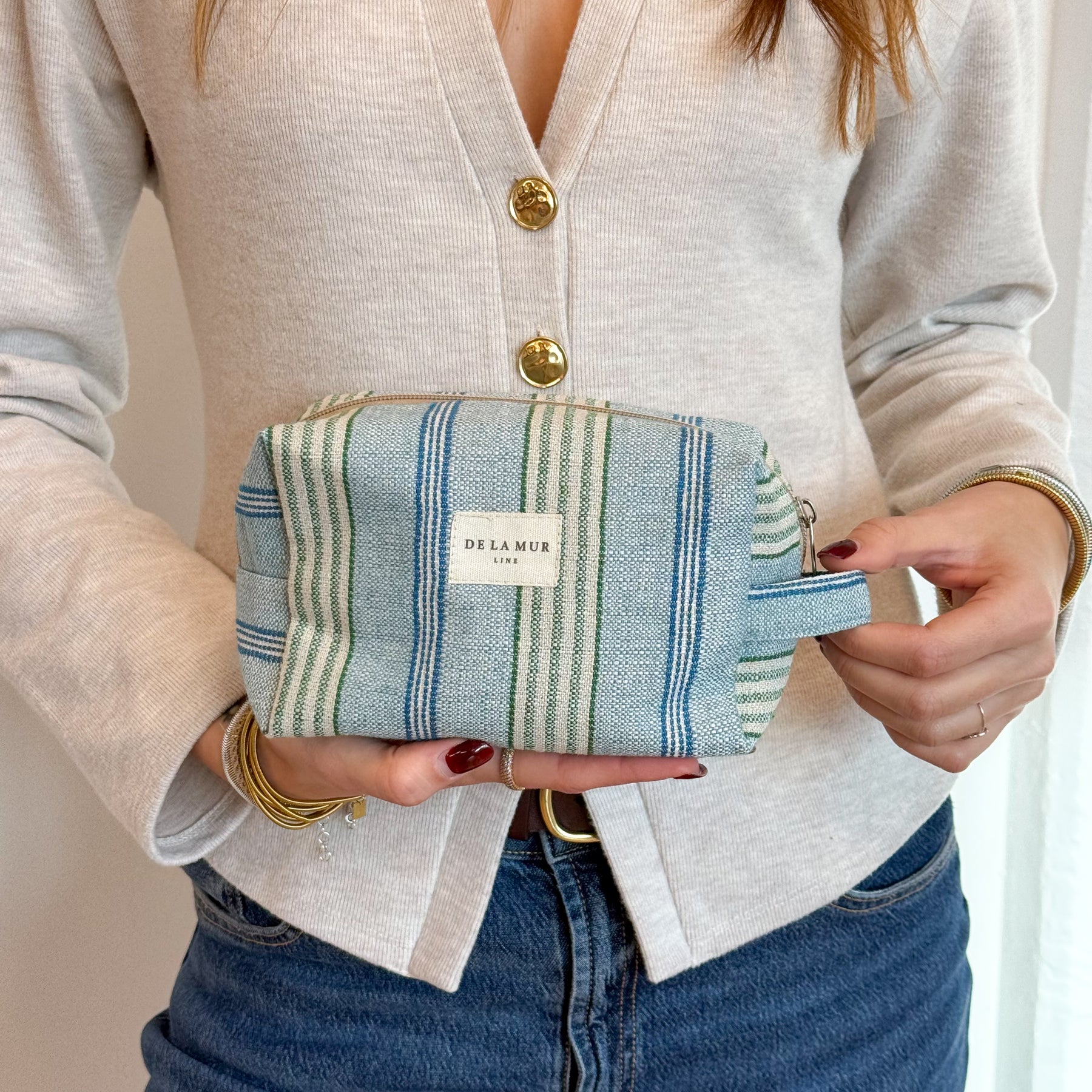 Blue and green striped jacquard pouch with top zipper and side handle—perfect for storing makeup, skincare, and small essentials.